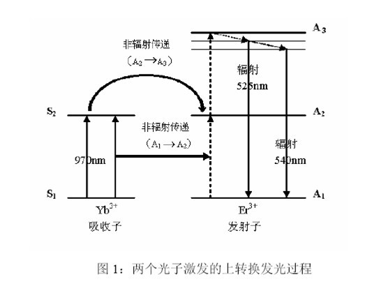自然界中存在很多有機或無機物質,它們可以在電磁輻射激發(fā)下發(fā)射熒光或磷光,且在發(fā)光過程中遵守Stokes 規(guī)則,即發(fā)射光的波長長于激發(fā)光的波長。而在20 世紀70 年代,科學家們卻合成了一類可以反Stokes 規(guī)則產(chǎn)生磷光的特殊材料,即UCP。UCP 在紅外光區(qū)(波長>780nm)被激發(fā),卻可以發(fā)射波長遠短于激發(fā)光的可見光(波長475nm-670nm),即能量上轉換。物質構成決定性質特點。UCP 是由稀土金屬元素摻雜于晶體的晶格中構成的。在這種材料中有三種主要的成分:主基質(Host Matrix)、吸收子(Absorber)和發(fā)射子(Emitter)。作為主基質的晶體材料有:氧硫化物(如Y2O2S、GdO2S、La2O2S 等)、氟化物(如YF3、GdF3、LaF3 等)、鎵酸鹽(如YGaO3、Y3Ga5O12 等)以及硅酸鹽(如YSi2O5、YSi3O7 等)等;常用作吸收子的稀土金屬離子有:鐿離子(Yb3+)、鉺離子(Er3+)、釤離子(Sm3+)等;常用作發(fā)射子的稀土金屬離子有:鉺離子(Er3+)、鈥離子(Ho3+)、銩離子(Tm3+)、鋱離子(Tb3+)等。吸收子和發(fā)射子這一離子對在主基質晶格內適宜的空間取向和距離,是產(chǎn)生上轉換發(fā)光的基礎。上轉換發(fā)光的產(chǎn)生是一個涉及多個(至少兩個)光子的光學過程。在這個過程中(如圖1),UCP 內的吸收子(如Yb3+)至少要吸收兩個低能量光子(紅外光區(qū),970nm),而后經(jīng)過一系列內部能量轉換,以非輻射的形式(A1A2A2A3)將這兩個光子的能量連續(xù)傳遞給發(fā)射子(如Er3+),以使其處于激發(fā)態(tài)(A3)。后者接著發(fā)生一個返回基態(tài)能級的躍遷,釋放一個高能光子(可見光區(qū),如525nm 540nm),完成能量上轉換。