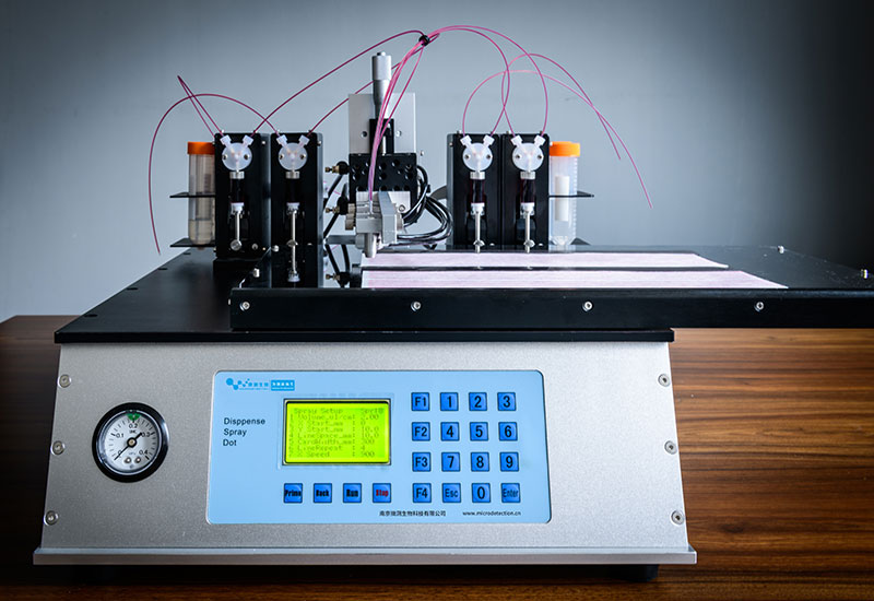 大平臺多通道噴金標(biāo)機應(yīng)用于生產(chǎn)過程中均勻地把膠體金,熒光微球,量子點等顆粒均勻地噴在聚酯膜,玻纖等材料上。相比于傳統(tǒng)的噴金機,效率大大提高,是特大型企業(yè)必備的生產(chǎn)設(shè)備之一。